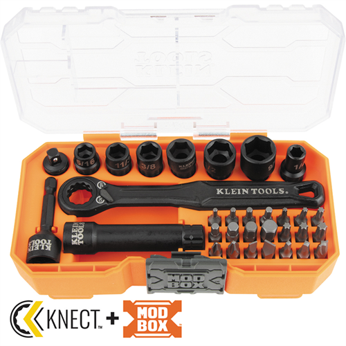 - Klein KNECT™ Small Pass Through Socket Set with 7 sockets, 21 screwdriver bits, extension, impact adapter, 1/4-Inch square adapter, and handle