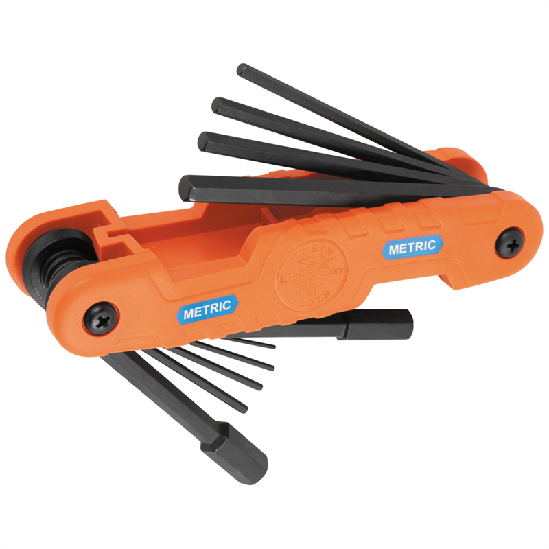 Klein Tools' Pro Folding Hex Key line features a highly durable reinforced nylon handle with easy access to each key. The heavy-duty 10-Piece set includes 4-Inch-long extended reach blades and a strategically placed #2 Phillips fastener on the outer body for effortless key tension adjustment. Klein Tools' hex sets are color-coded for quick identification: red for inch, blue for mm, and green for Torx®, enhancing efficiency.