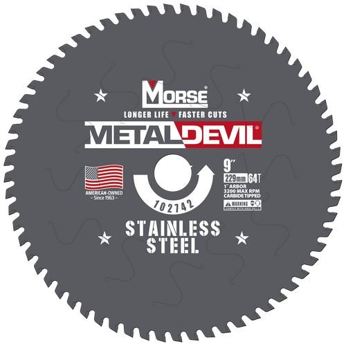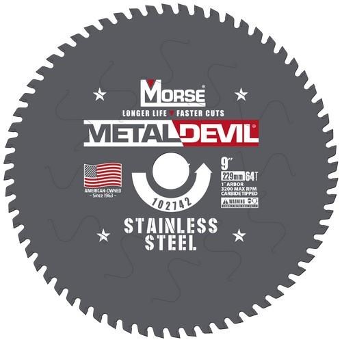 Morse Metal Devil, CSM964FSSC (102742), is specifically designed for cutting stainless steel plate or small solids not exceeding in 1/4" thickness, and tubing, channel, or other structural shapes not exceeding 1/8" wall thickness. Blade comes standard as 1" arbor.