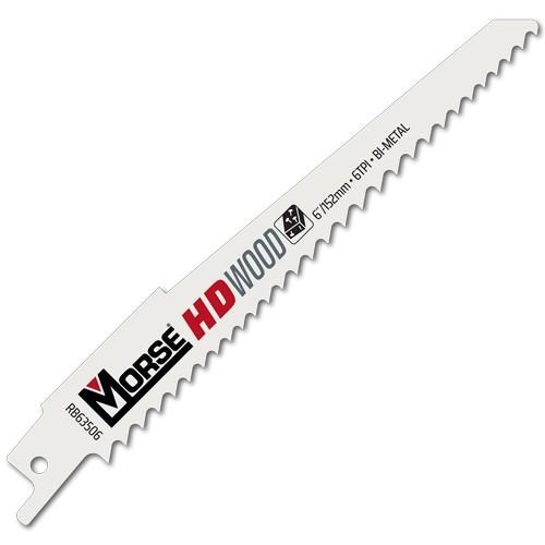 Morse RB63506T05 (400190), 6" x 6 tooth, bimetal reciprocating saw blade is specifically designed for cutting all types of wood, nail-embedded wood and wood composites. Tapered blade body eases the ability to plunge cut. Reinforced tooth profile resists premature tooth strippage in nail-embedded wood applications. Standard .035" blade thickness provides flexibility to reach tight spaces. Five (5) blades per pack.