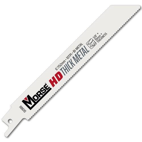 Morse RB610T50 (400381), 6" x 10TPI, bimetal reciprocating saw blade is designed for cutting metal, 3/8" and thicker. Straight blade body reduces blade deflection, under feed pressure. Standard .035" blade thickness provides flexibility to reach tight spaces. Fifty (50) blades per pack.