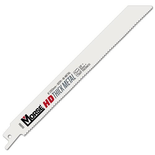 Morse RB810T50 (400466), 8" x 10TPI, bimetal reciprocating saw blade is designed for cutting metal, 3/8" and thicker. Straight blade body reduces blade deflection, under feed pressure. Standard .035" blade thickness provides flexibility to reach tight spaces. Fifty (50) blades per pack.