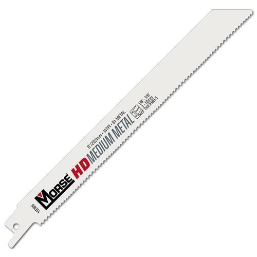 Morse RB814B100 (406239), 8" x 14TPI, bimetal reciprocating saw blade is designed for cutting metal, from 1/8", up to 3/8", thickness. Straight blade body reduces blade deflection, under feed pressure. Standard .035" blade thickness provides flexibility to reach tight spaces. One hundred (100) blades per box.