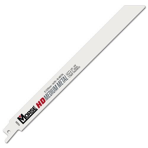 Morse RB914B100 (406246), 9" x 14TPI, bimetal reciprocating saw blade is designed for cutting metal, from 1/8", up to 3/8", thickness. Straight blade body reduces blade deflection, under feed pressure. Standard .035" blade thickness provides flexibility to reach tight spaces. One hundred (100) blades per box.