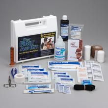 44 piece large pet first aid kit includes all the special items your pets may need in the event of an accident. Contains bandages, wound care items, antiseptic, peroxide for vomiting, pet first aid guide.