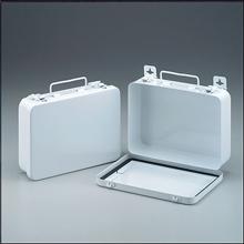 - This horizontally configured empty metal first aid case features 1 shelf, hinges and a gasket.