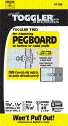 Built-in spacers hold the pegboard the proper distance from the wall to allow peg hooks to work. The anchors eliminate furring strips, letting you configure the peg hooks in any arrangement you choose, quickly and easily, without losing the use of entire lines of peg holes.
