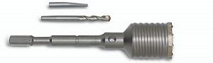 Heavy wall core bits are machined from a single piece of forged steel for long life and are designed for use with Spline or SDS-Max rotary hammers. The top or head of the bit is crowned to direct the hammering energy through the outside wall and into the cutting teeth. The carbide cutting tips are made with a slighty negative cutting angle on the face to allow them to be used in the rotary hammering mode. To provide optimum drilling, the carbide tips or teeth are inserted at irregular intervals in the core to minimize vibration and one piece and two piece core bits are offered. One piece bits have a shank which is friction welded to the forged core body provide the most efficient drilling. Two piece bits have rope threads machined to tight tolerances to minimize energy loss at the connection. As with all adapters, there is normally a 10 to 15% loss of hammering energy with a two piece system.
