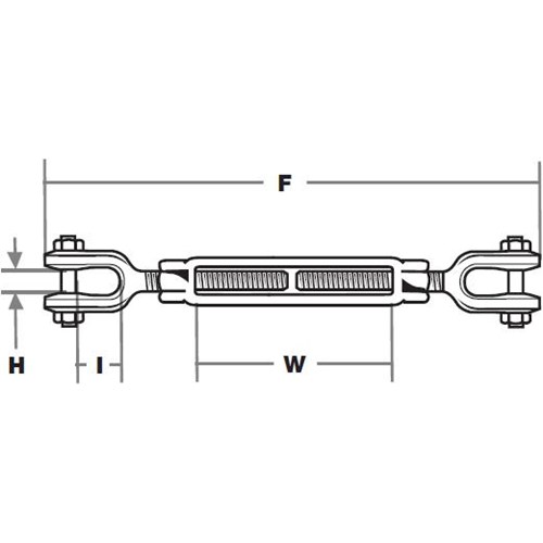 Threaded Dia. x Take-up (inches): 5/8 x 12; F (Closed): 18.80; H: 0.79; I: 1.31; W: 12.00; Weight Each: 3.53; Working Load Limit*: 3500