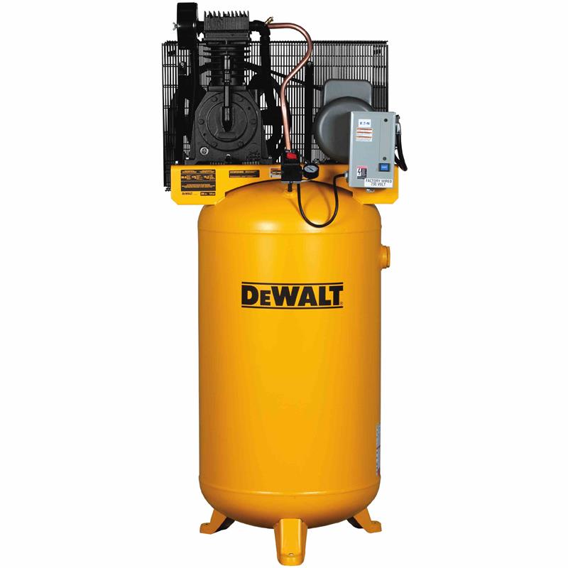 The DEWALT 80 Gallon Belt Drive Compressor features a cast iron, twin cylinder, two stage, oil lubricated pump, a Baldor low 1725RPM industrial grade 240 volt induction motor, integrated magnetic starter and is shipped with synthetic oil.