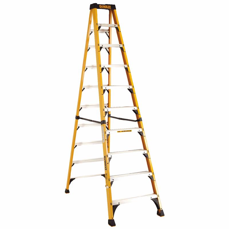 This 10 foot non-conductive DEWALT fiberglass step ladder has a load capacity of 375lbs, rated ANSI Type IAA. This ladder features an innovative top with magnet and multiple tool slots, 25% greater step surface, an impact absorption system, heavy duty boots with non-marring bonded tread mechanically fastened to the upper boot to create a secure slip-resistant footing, wrap-around internal spreader braces, wide back braces, and double-rivet step construction. This DEWALT DXL3410-10 step ladder meets or exceeds the safety standards set by ANSI, CSA, and OSHA.