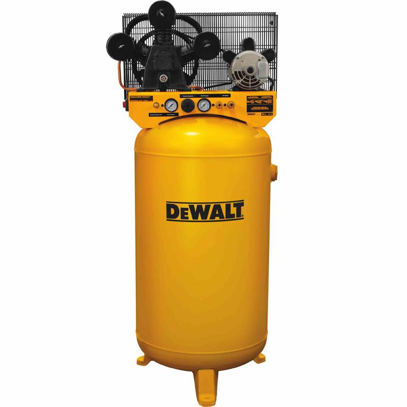 The DEWALT 80 Gallon Belt Drive Compressor features a cast iron, three cylinder, single stage, high-flow oil lubricated pump, a heavy duty 240 volt induction motor, and is shipped with synthetic oil.
