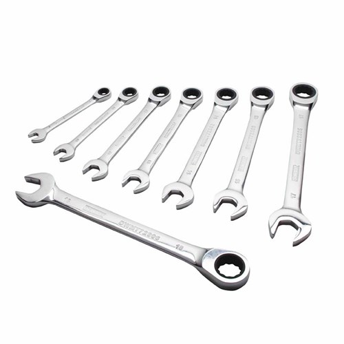 With the 8 Piece Ratcheting Combination Wrench Set, you'll be sure to have the right tool for the job. These wrenches have a full polish chrome finish and include sizes on both sides of the handle making it easy to locate the correct size.