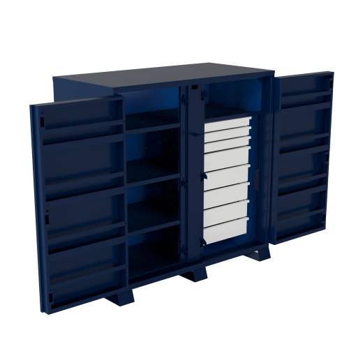 A customized organization solution with a full-length top shelf - plus dividers that can be arranged to create multi-sized spaces to store small or bulky items. 3-point security system with secure padlock enclosure. Built-in heavy-duty doors with anti-slip bars to keep items secure. Twist-to-open latch between front doors. Movable bin dividers.