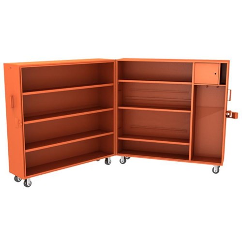 A movable storage solution with an internal locker for added security. Includes 4 fixed & 4 swivel 4" casters. Heavy duty hasp. Fixed shelf. Adjustable shelves. Internal storage locker. (3x) 61" long shelves on left side. (3x) 48" long shelves on right side.