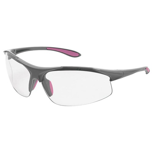 Sunglass fashion ANSI protection safety glasses has 8 base curve dual lenses that are coated polycarbonate and provide 99% UV protection. Soft rubber nose pads and integrated rubber temples give non-slip hold. Stainless steel hinge screws. Meets the requirements of ANSI Z87.1 - Impact.