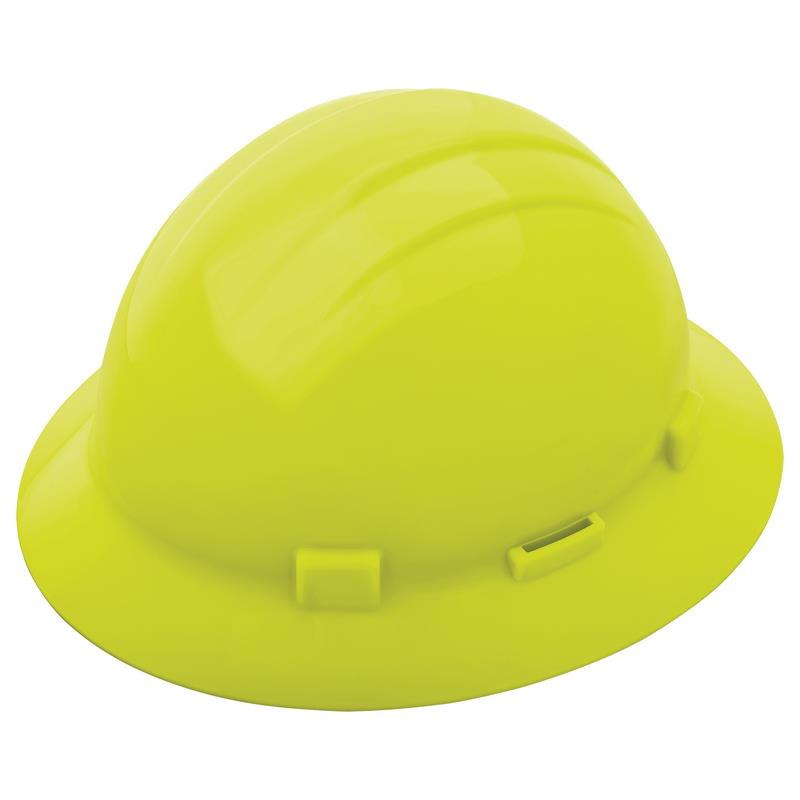 High density polyethylene full brim hard hat features a 4-point woven nylon suspension with easy-turn knob Mega Ratchet sizing which adjusts from head sizes 6 1/2 - 8. Hinged, padded ratchet is low hanging and adjustable for a perfect fit. Accommodates chin strap. Goggle retaining slots molded on suspension. Accessory slots accommodate a variety of eye, face and hearing products. Moisture wicking brow pad is removable, washable and replaceable. Meets the Low Temperature (LT) option of the Z89.1 standard. Meets ANSI Z89.1 Type I, Class C, E and G requirements. Made in USA.