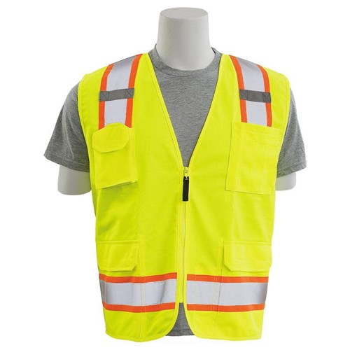 ANSI/ISEA 107 - 2015 Type R, Class 2 Surveyor vest. 100% polyester tricot solid front and back. Silver reflective tape backed by contrasting trim. Eleven pockets: 1 split pad/pencil pocket, 1 flapped gusseted radio pocket, 2 exterior waist pockets with hook & loop closure, 2 interior open waist pockets, 1 interior flashlight pocket. At least one pocket measures large enough to fit a 5.5" cell phone in sturdy case. Mic tabs on both sides.