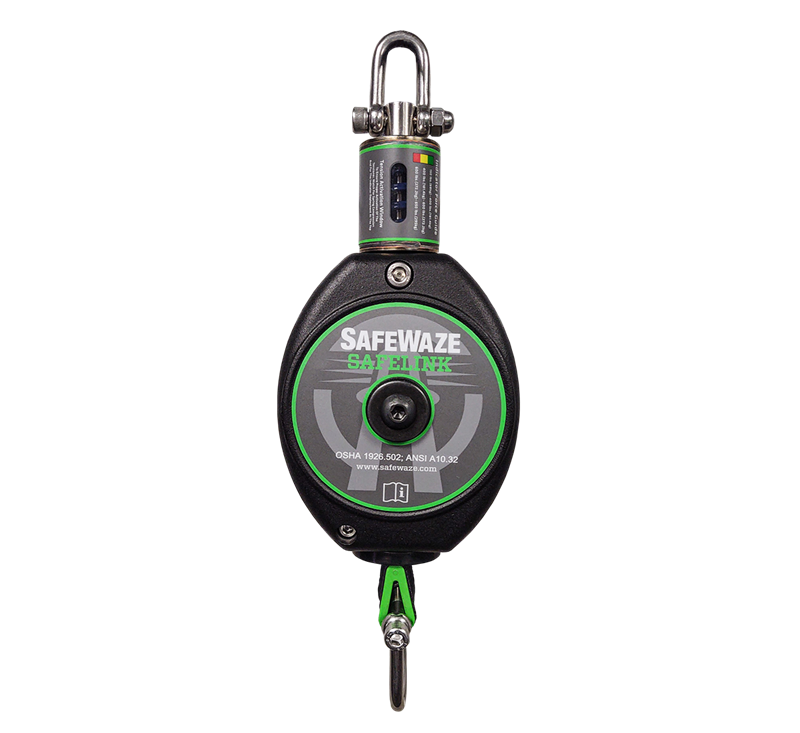 The StopLink brake assembly is an inline absorber for the SafeWaze Mobile SafeLink system and subdued edge work. This brake allows four workers to be tied off at the same time, and with low minimum clearance heights. SafeLink, the result of a decade of development, addresses the difficulties of work on the leading surface edges of a building under construction, and other applications where horizontal work and low clearance fall hazards exist.