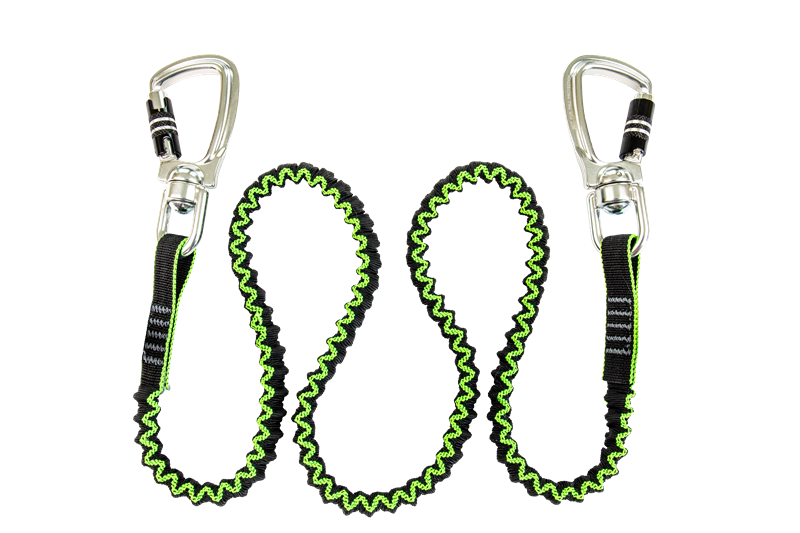 The SW434 80 lb heavy duty tool tether features a swivel aluminum twist locking carabiner on each end. Its elasticated, energy absorbing webbing allows it to stretch from 64" to 80.5".