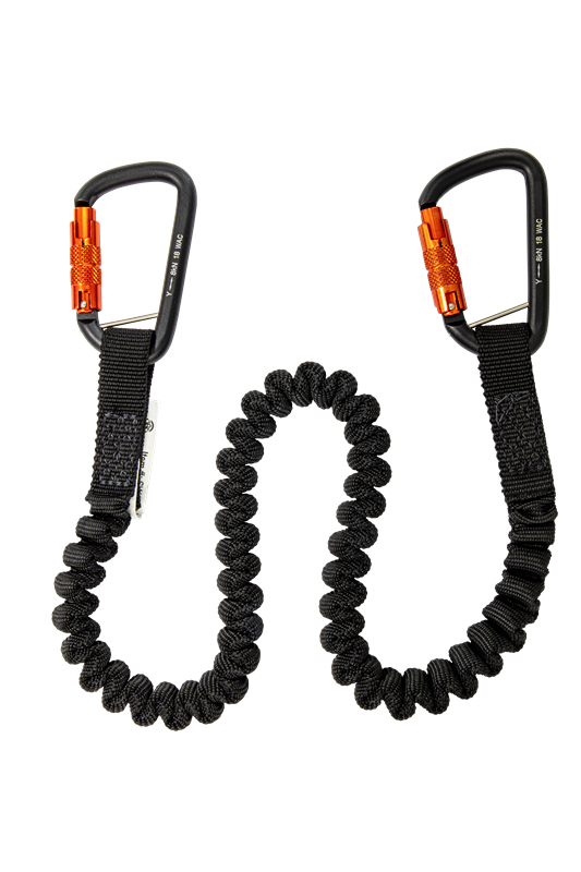 The SW436 15 lb tool tether features an aluminum twist locking carabiner on each end. Its elasticated webbing allows the tether to stretch from 31" to 61".