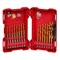 Our SHOCKWAVE™ RED HELIX™ Titanium Drill Bits are engineered for extreme durability and long life. The QUAD EDGE™ tip delivers a precision start and four cutting edges to create smaller chips for faster removal and less heat for longer bit life. The Variable Helix ™ design includes an aggressive 35° helical angle, which ends at 15°, these titanium drill bits with RED HELIX™ provide Rapid Chip Removal™ limiting heat buildup to Stay Sharper Longer™. The bits also feature an internal ENHANCED TAPERED WEB that greatly increases their strength, reducing premature breakage. Our titanium drill bits are ideal for various applications, including but not limited to wood, plastics, and metals. MILWAUKEE® Red Helix Titanium Drill Bits provide up to 5X life vs. black oxide drill bits.
