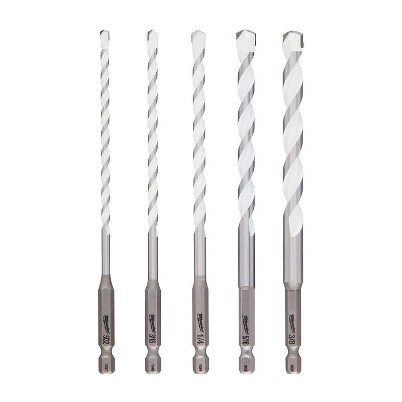 The MILWAUKEE® 5-Piece SHOCKWAVE™ Carbide Multi-Material Drill Bits are the most versatile bits, designed to tackle a variety of materials, including brick, block, concrete, steel, aluminum, ceramic tile, backerboard, wood, PVC, and drywall. The aggressive multi-grind carbide tip delivers up to 10x longer life in stacked materials and up to 85% faster drilling speeds in metal. Equipped with a 1/4" hex shank, these general-purpose drill bits are compatible with impacts, drill/drivers, and hammer drills. These Milwaukee drill bits provide the ideal all-in-one solution for the widest variety of materials, tools, and applications. This kit incudes (1) 5/32", (1) 3/16", (1) 1/4", (1) 5/16", and (1) 3/8" SHOCKWAVE™ Carbide Multi-Material Drill Bits.