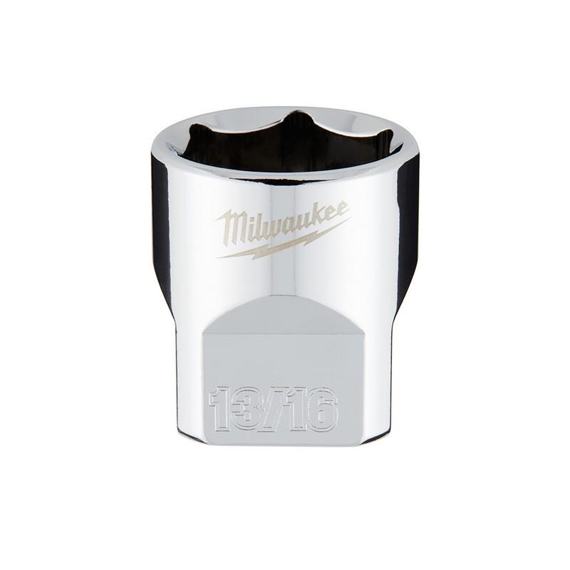 The Milwaukee 3/8 in. drive 13/16 in. SAE 6-point socket was designed from the ground to be part of the most versatile socket family. The innovative socket design has four parallel flat sides, which deter rolling and are wrench-compatible. Socket sizes are stamped into the flats for improved easy-to-read visibility. Optimized socket geometry helps reduce bolt rounding and stripping.